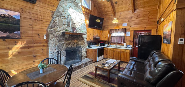 The “Couple’s Retreat” is one of Yokum’s newest log cabins and makes an excellent honeymoon suite, with its Jacuzzi tub big enough for 2. It is located near the Family Cabins and the old Seneca Rocks School House, just south of Yokum’s restaurant. It is a 1 Bedroom unit, with a king sized bed, a large living and dining area, fully equipped kitchen, central air and fireplace. Linens and towels provided. There is also a gas grill on the deck. While there is currently no wi-fi, this cabin is perfect for relaxing with a loved one.